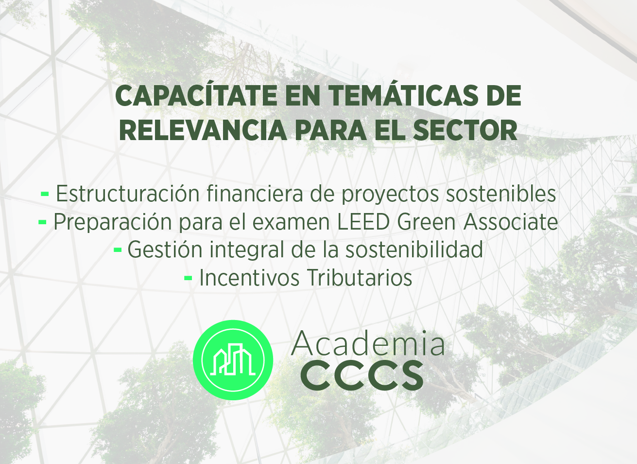 Autorizo expresamente al CONSEJO COLOMBIANO DE CONSTRUCCIÓN SOSTENIBLE, CCCS NIT. 900.203.493-4, para almacenar, recolectar, usar gestionar, analizar, realizar procesos administrativos, tratar, ceder, transmitir, y/o transferir datos personales que le suministro mediante el presente formulario, con la finalidad de ser utilizados para el desarrollo y presentación de la oferta de valor y servicios por parte del CCCS dentro de los que se incluyen eventos y/o cursos de capacitación, solicitud de evaluación de calidad de nuestros servicios, entre otros. Esta autorización abarca la posibilidad de recolectar y almacenar los datos suministrados en los sistemas que a tal fin disponga el CCCS. Declaro que me he enterado de mi derecho a conocer el uso dado a la base de datos, además de acceder, actualizar, revocar y/o rectificar los datos autorizados en cualquier momento de forma gratuita por medio del correo electrónico info@cccs.org.co o a la dirección física Carrera 7 # 71-21, Edificio Avenida Chile, Torre A, Piso 5, Bogotá D.C., Colombia, en cumplimiento de lo dispuesto en la Ley 1581 de 2012 y el Decreto 1074 de 2015, así como la normatividad vigente en la materia en Colombia.
